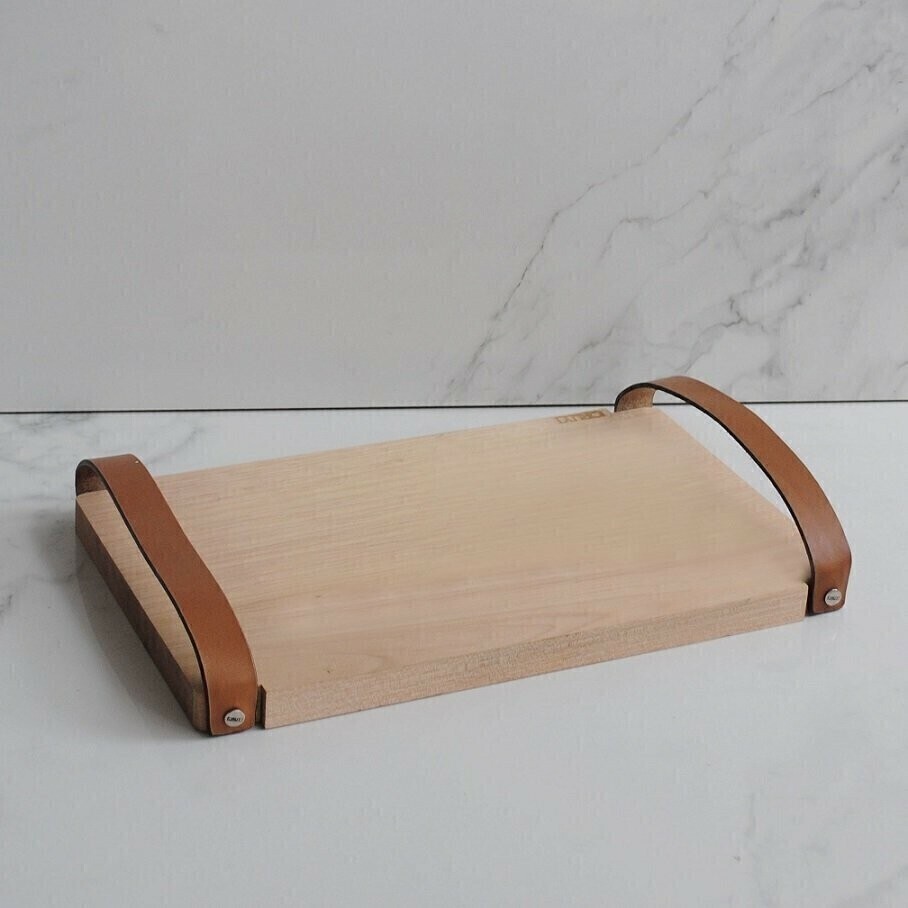 Bandeja com alça em Couro - Bandeja Flinders, de Fácil ambientação. peça retangular em madeira nobre tauari maciço com alças em couro legítimo