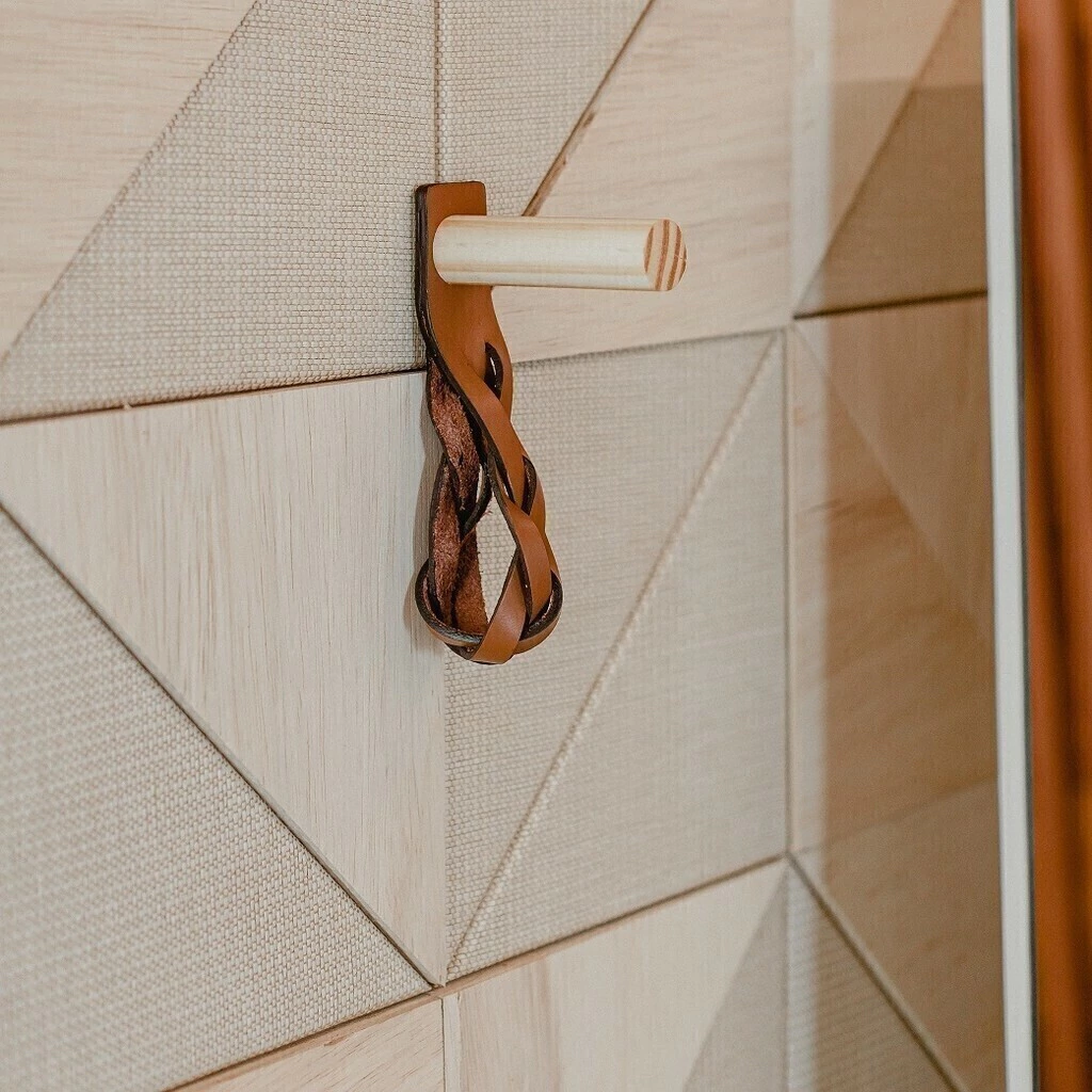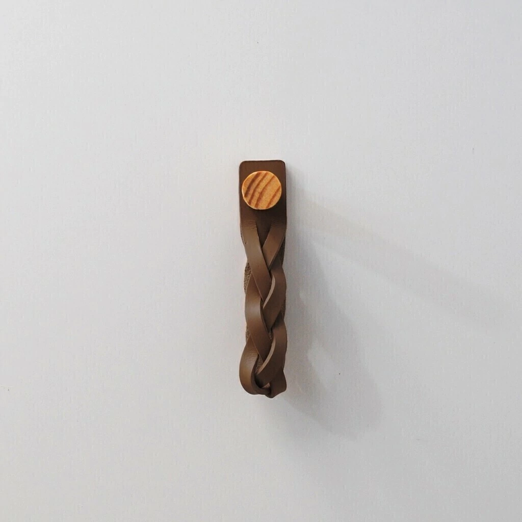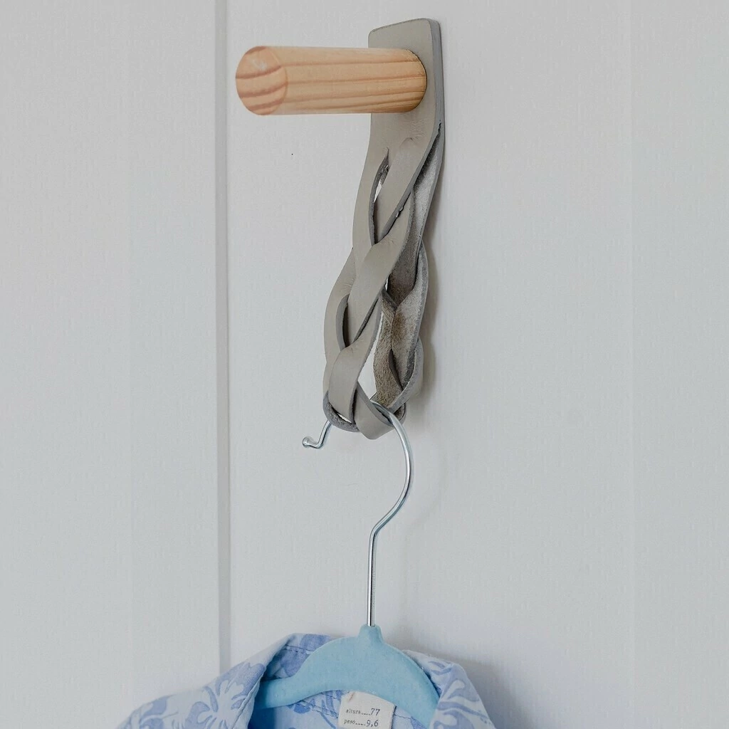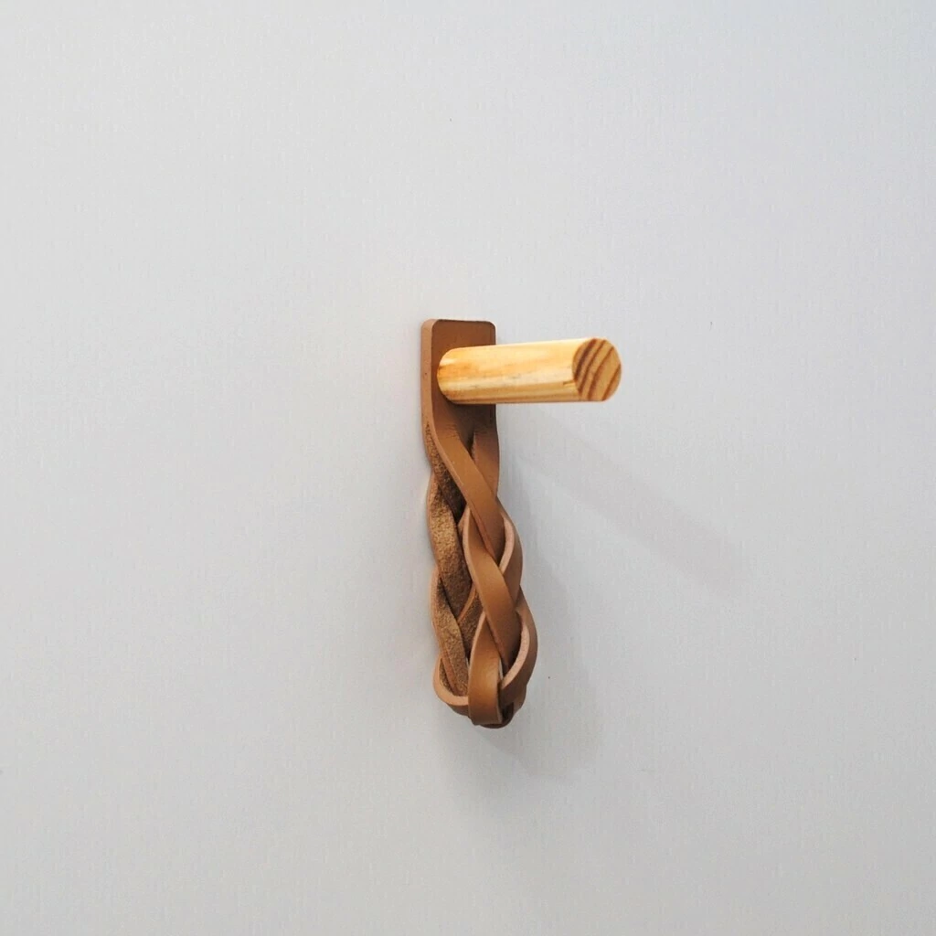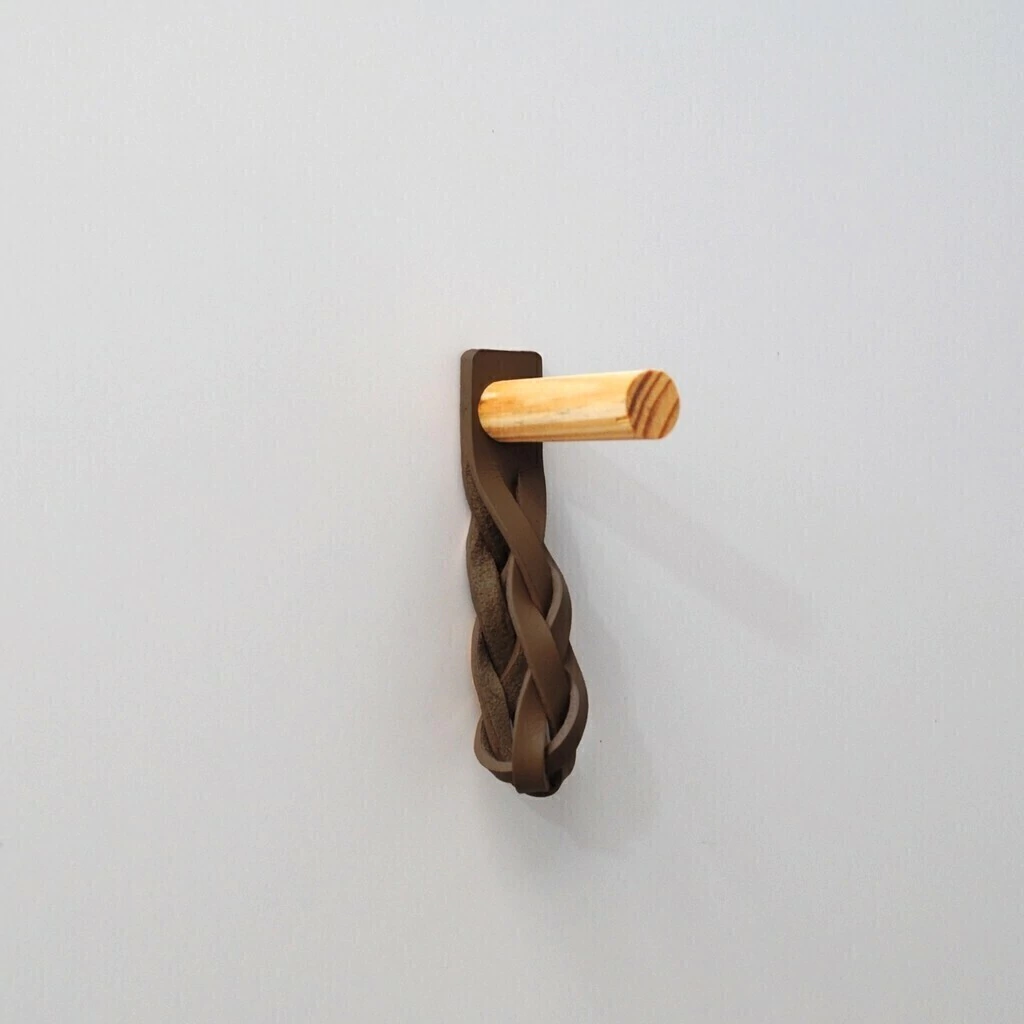 Cabideiro / Pendurador Treccia Oruy, peça artesanal desenvolvida em couro trançado e madeira maciça, ideal para pendurar casacos, bolsas, chapéus e outros acessórios.