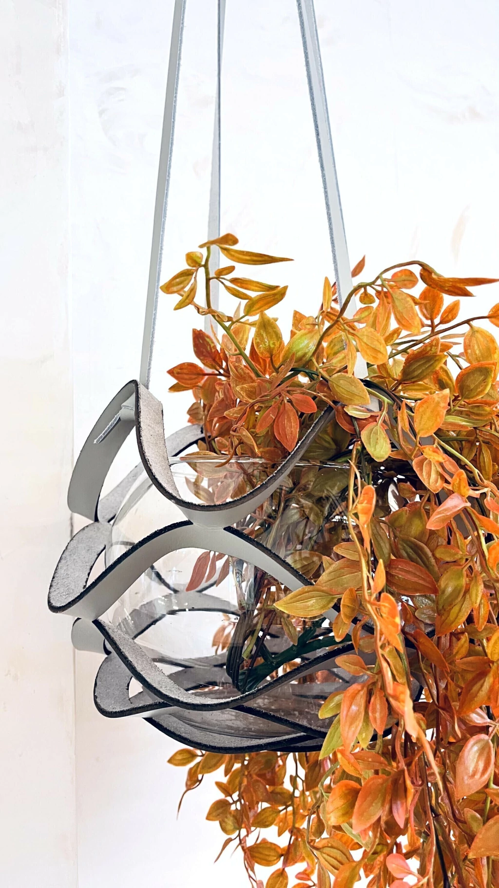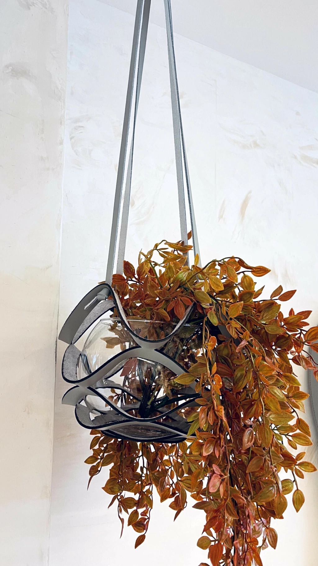 Dimensões: altura regulável das tiras de couro entre 15 e 75cm. Vaso indicado com fundo entre 10 e 15cm.