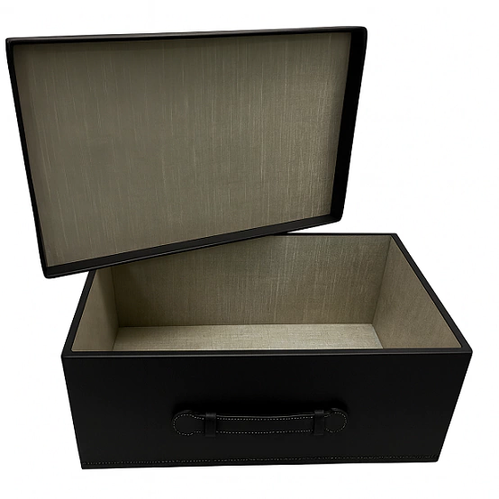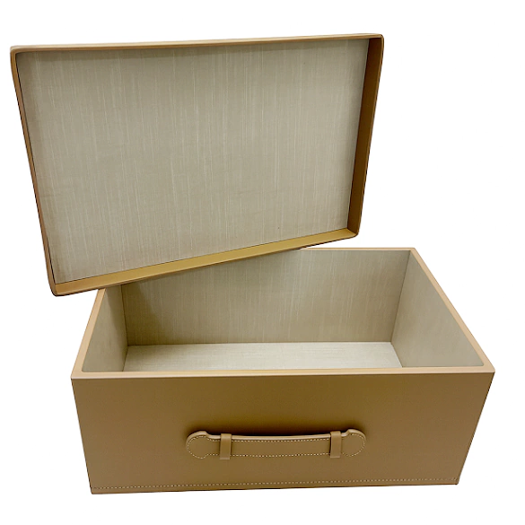 Versátil e atemporal, está disponível em cinco tamanhos e seis tonalidades de couro, adaptando-se a diferentes usos, seja para organização de ambientes, apoio decorativo em prateleiras ou composição em interiores contemporâneos.