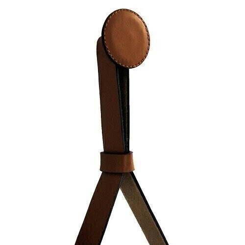 A moldura é toda em couro e com costura nas laterais, a fixação é feita através de uma alça com fivelas que envolve todo o espelho e se fixa à parede por um pino também revestido em couro.