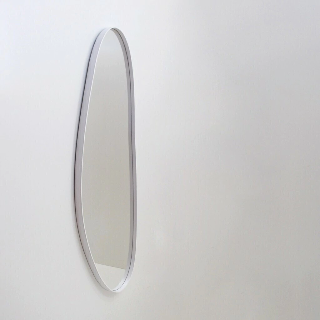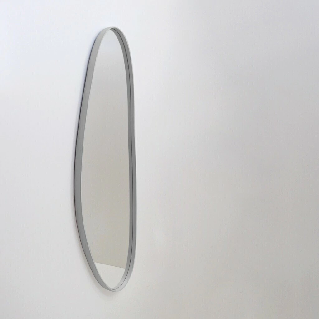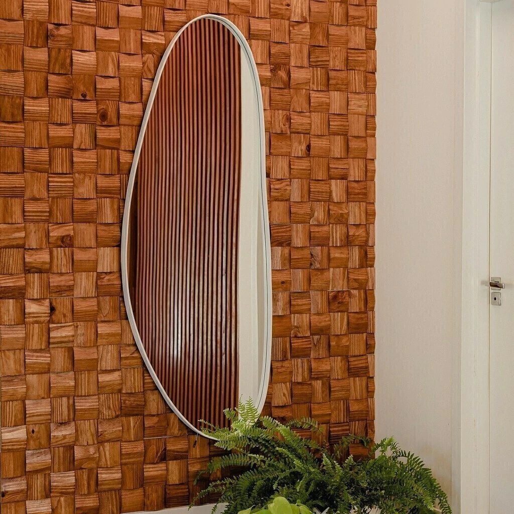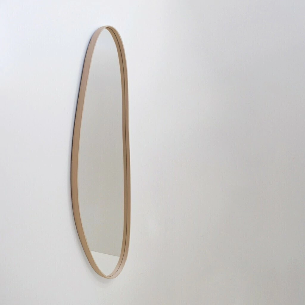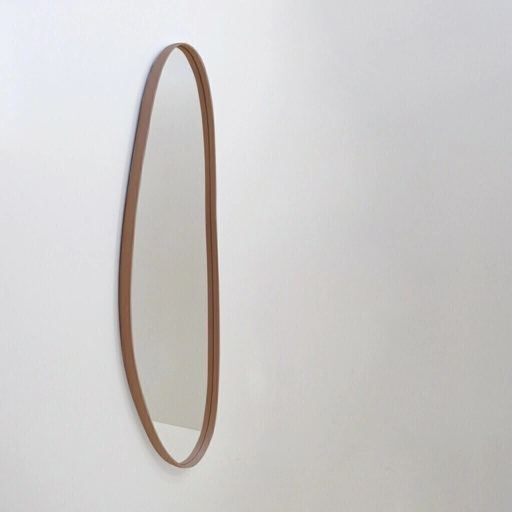 Espelho Orgânico Pescara Oruy com moldura em couro legítimo, remete a principal inspiração para a Coleção Sollievo: elementos e formas naturais.