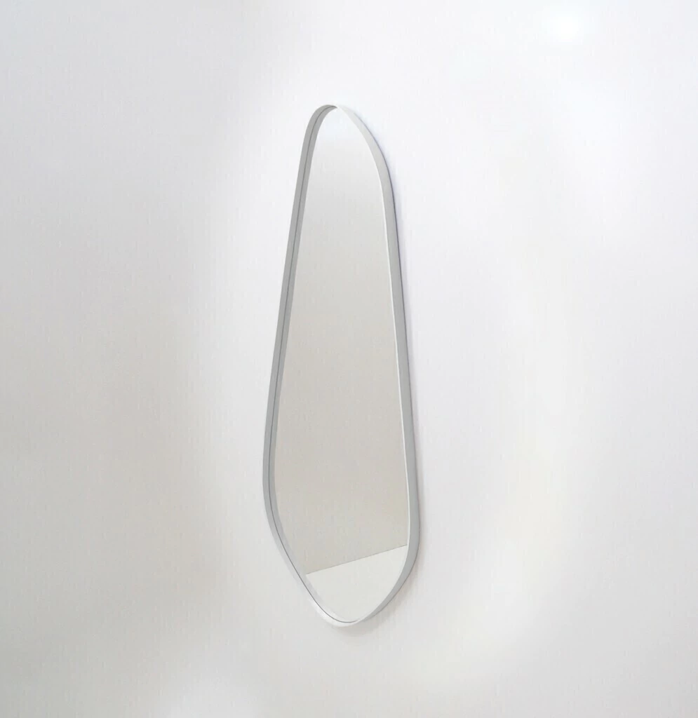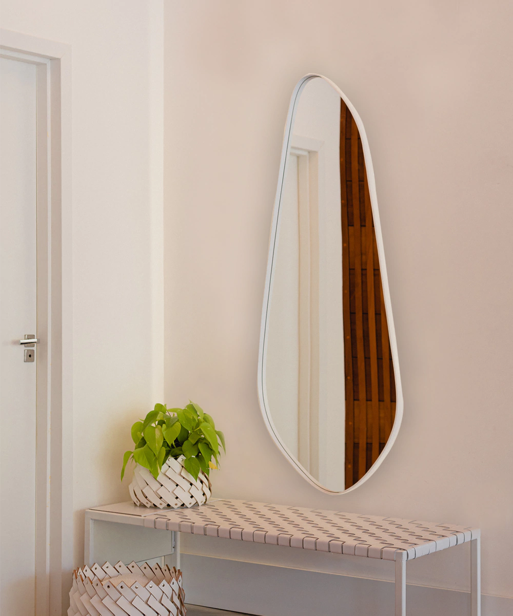 Espelho Orgânico Tropea Oruy com moldura em couro legítimo, remete a principal inspiração para a Coleção Sollievo: elementos e formas naturais.