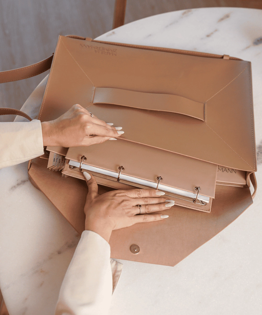 Disponível em três opções de couro: nude, preto ou caramelo, o Kit Coleção Singular contempla 1 Pasta Executiva, 1 Pasta A3, 1 Pasta A4, 1 Kit Abas e 1 Chaveiro.