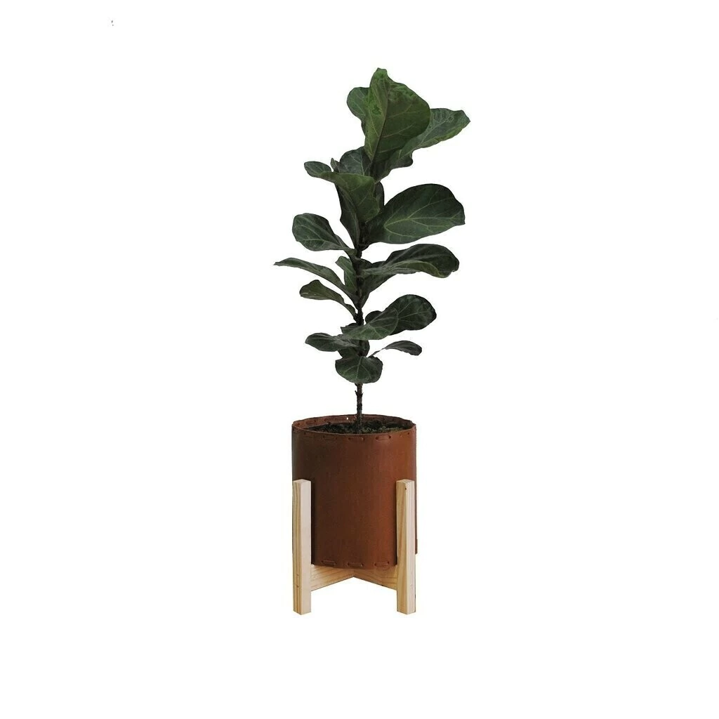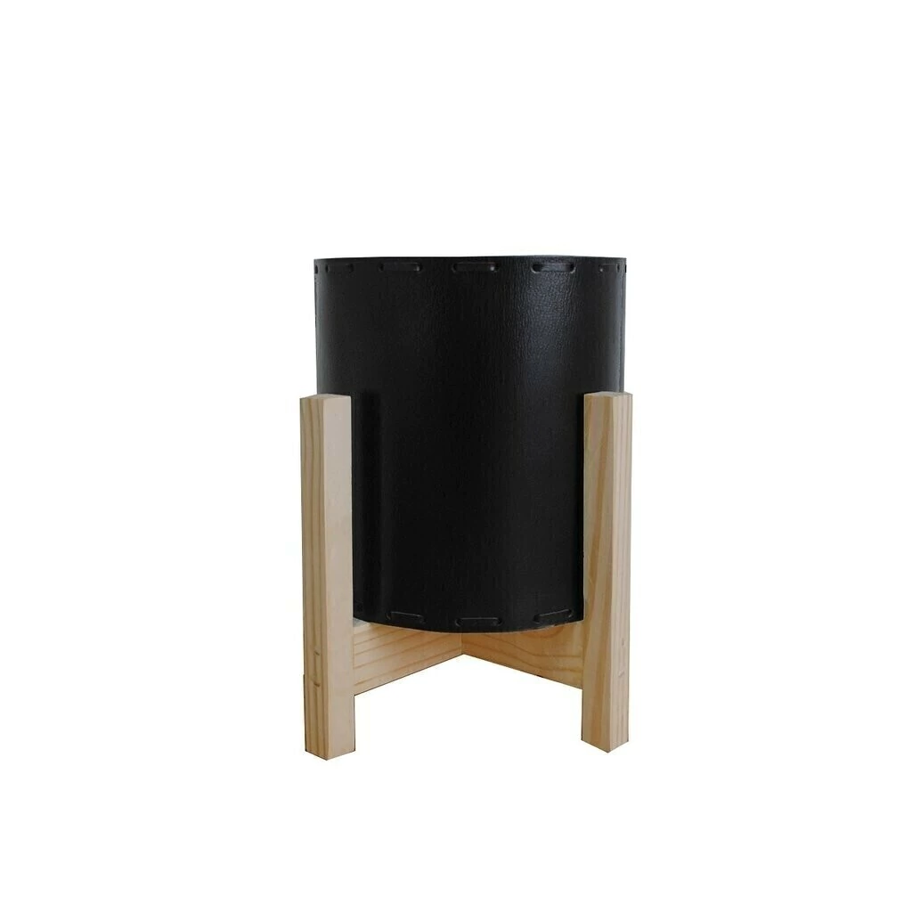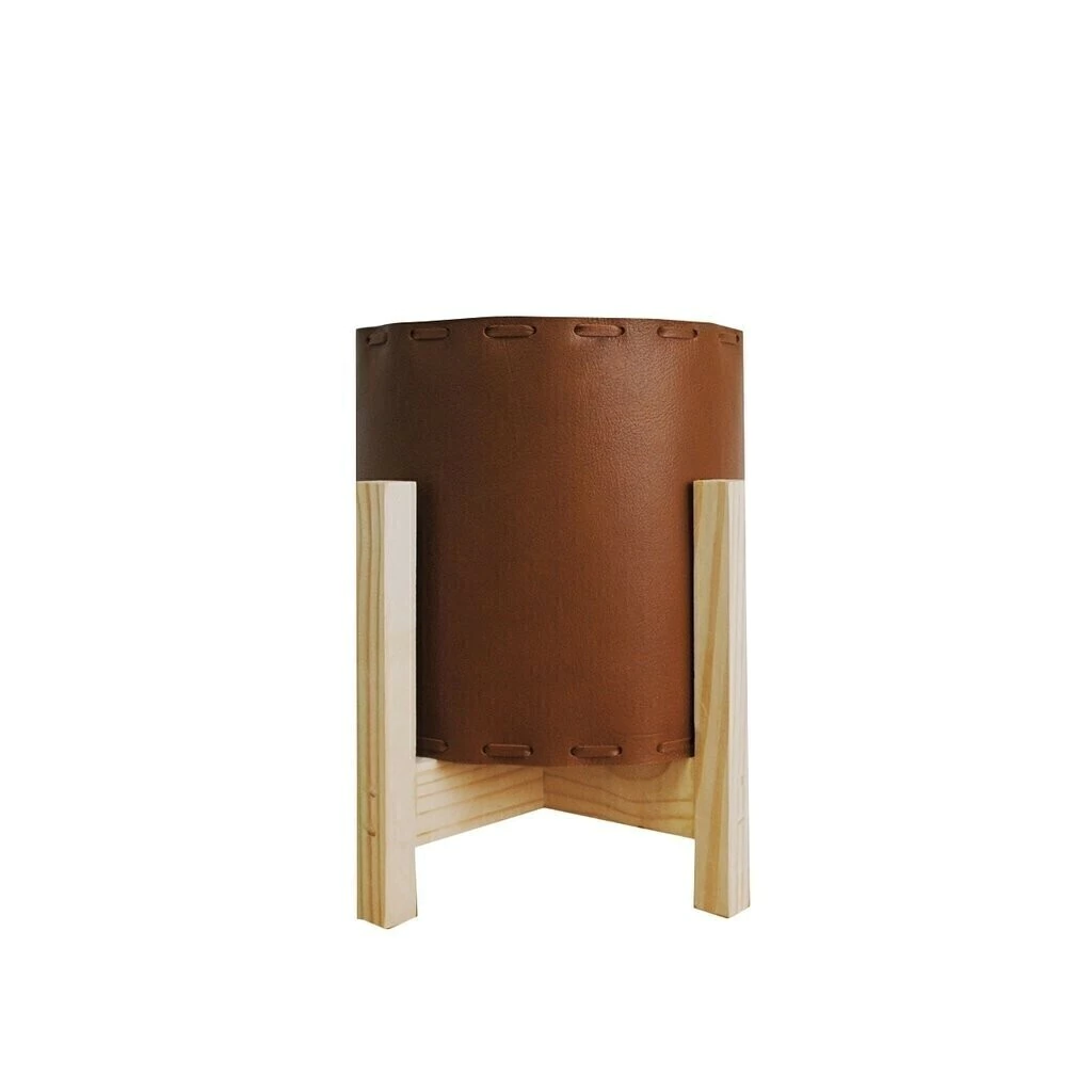 Mini Cachepot Vago Oruy em Couro reconstituído, tem em sua base quatro pés em madeira pinus, deixando um vão na parte inferior, que proporciona leveza e fluidez a peça.