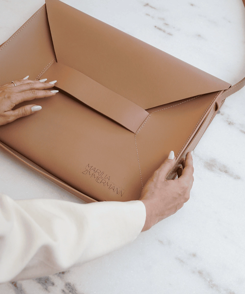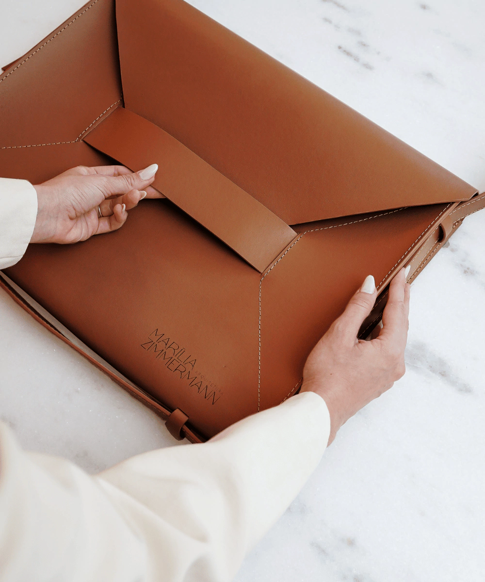 A Pasta Executiva foi desenvolvida em couro reconstituído e está disponível em três opções de cores: nude, preto ou caramelo.