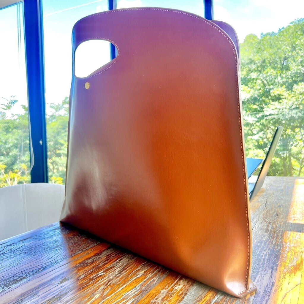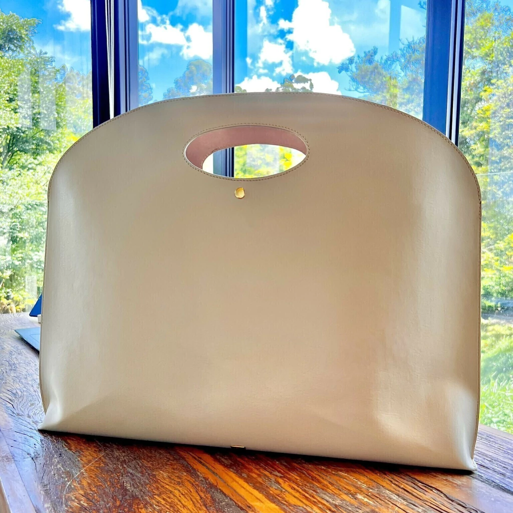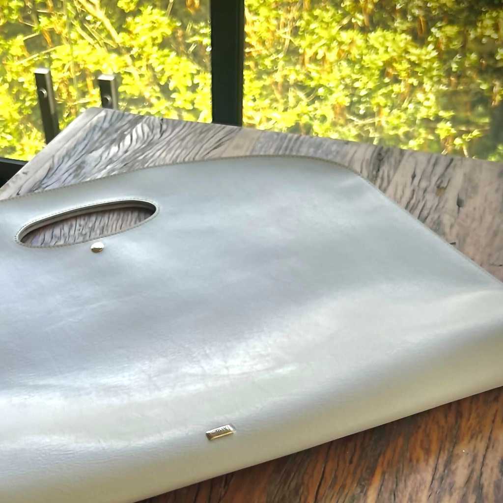 Está disponível nas cores caramelo e off white, ambas com botão de fechamento no banho dourado.