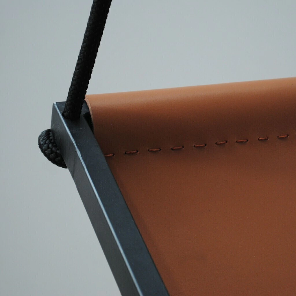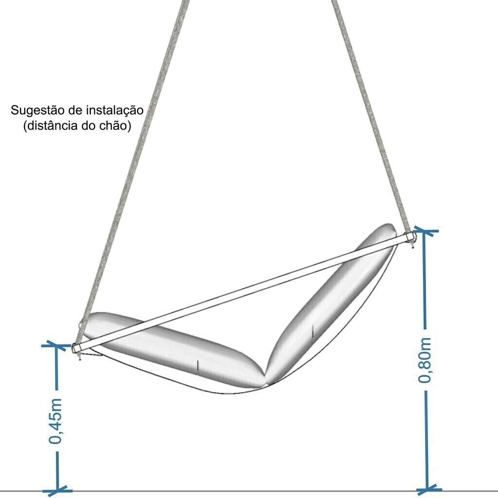 Sugestão de instação (Distância do chão) indicada na penúltima imagem. Material: aço carbono, couro. Acompanha almofada e gancho de fixação para teto em aço. Valor Unitário Suporta até 100kg.