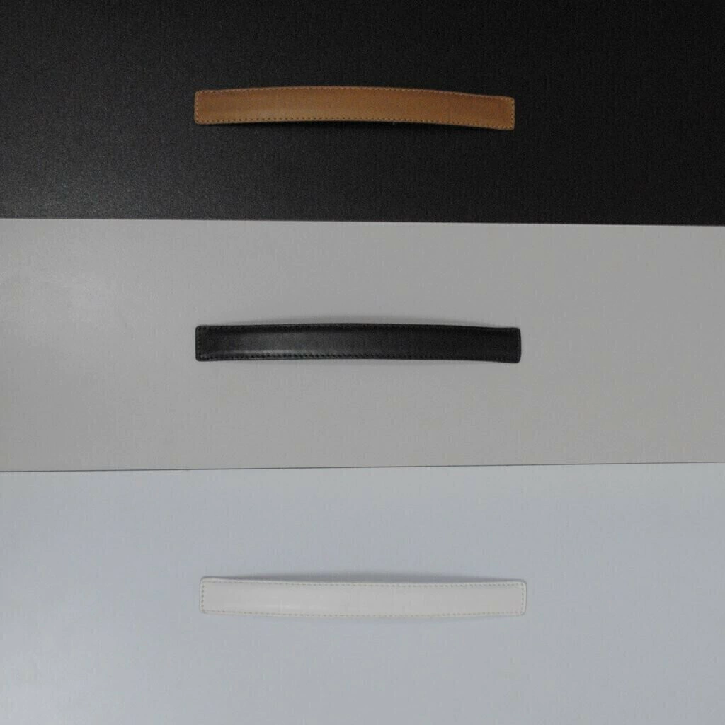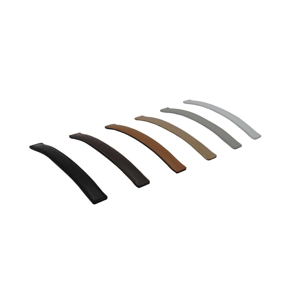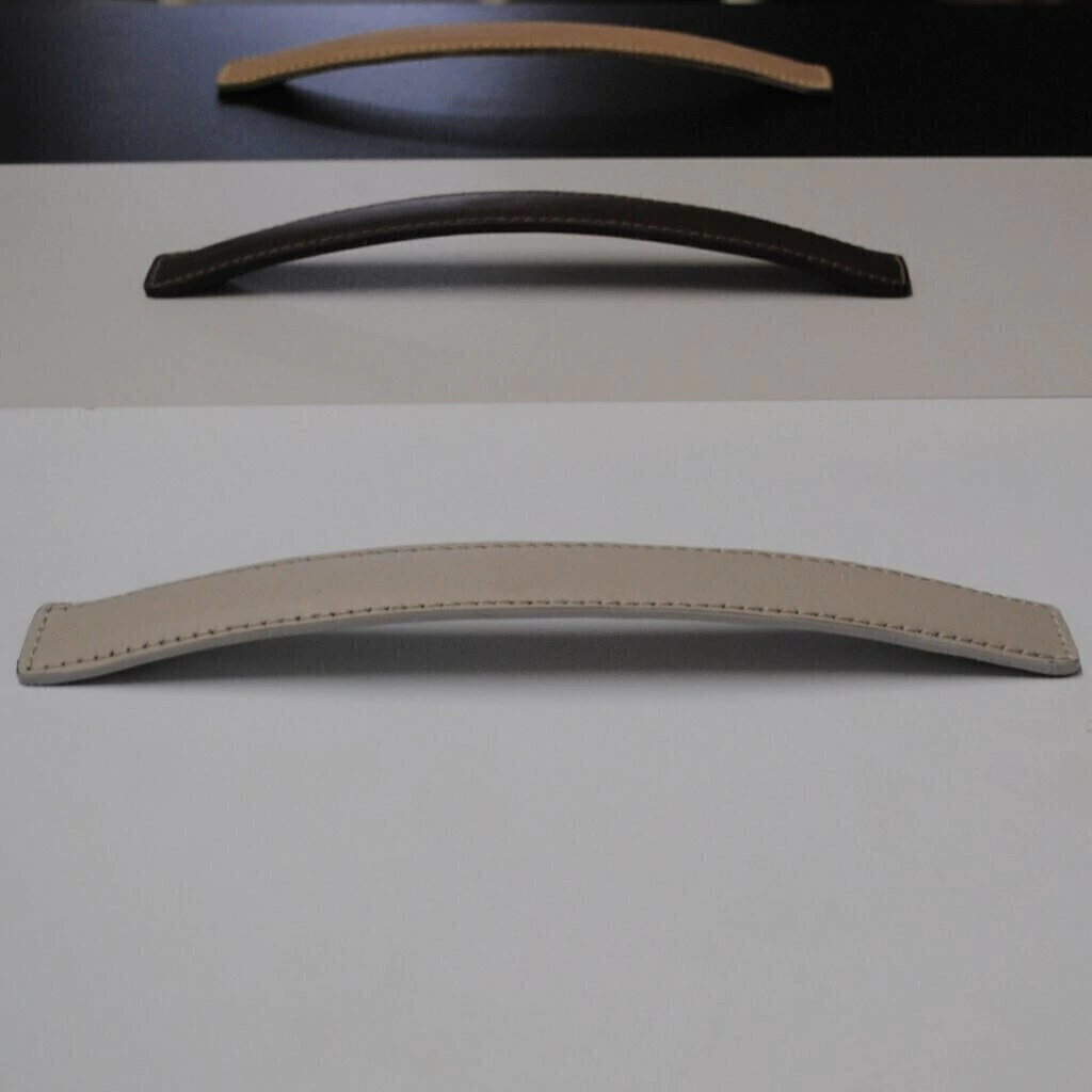 Puxador Arco, peça desenvolvida com metal revestido em couro legítimo e pesponto nas bordas, garantindo um acabamento impecável a peça.