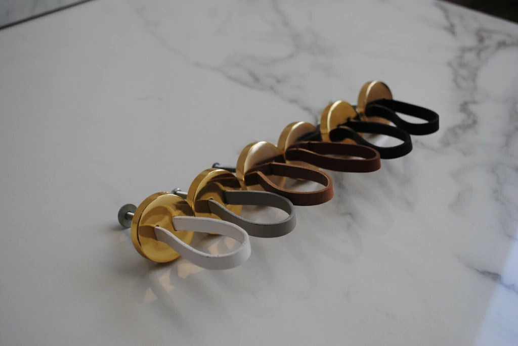 O Puxador Jolie é uma peça sofisticada que harmoniza uma base em metal e uma alça feita em couro legítimo.