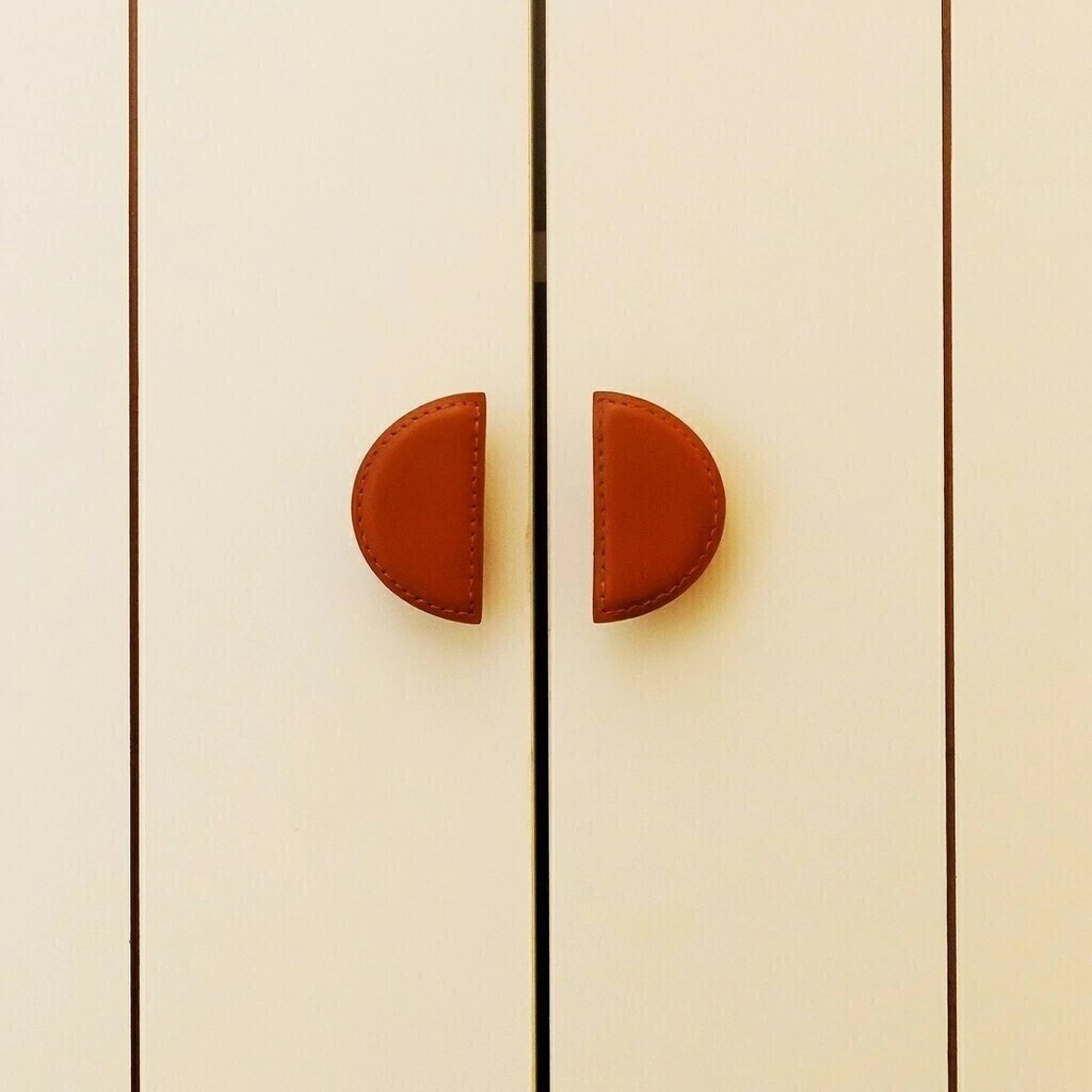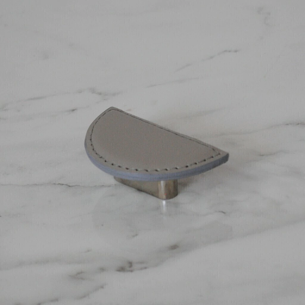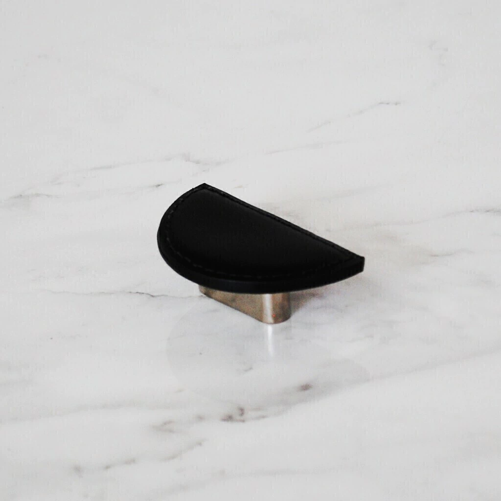 Puxador Rita P, peça em formato meia lua criada pela renomada arquiteta e designer Paola Cury, desenvolvida com metal revestido em couro reconstituído e pesponto nas bordas, garantindo um acabamento impecável.