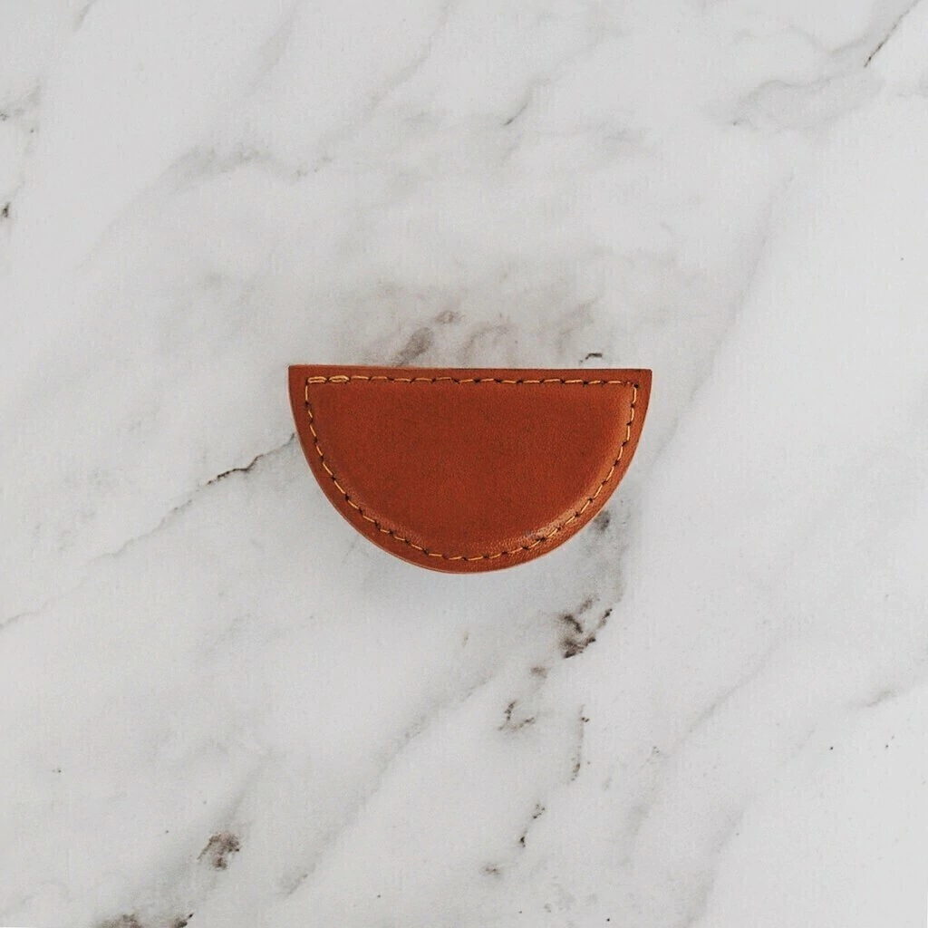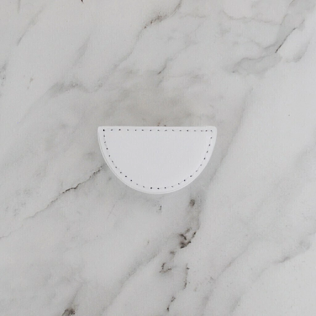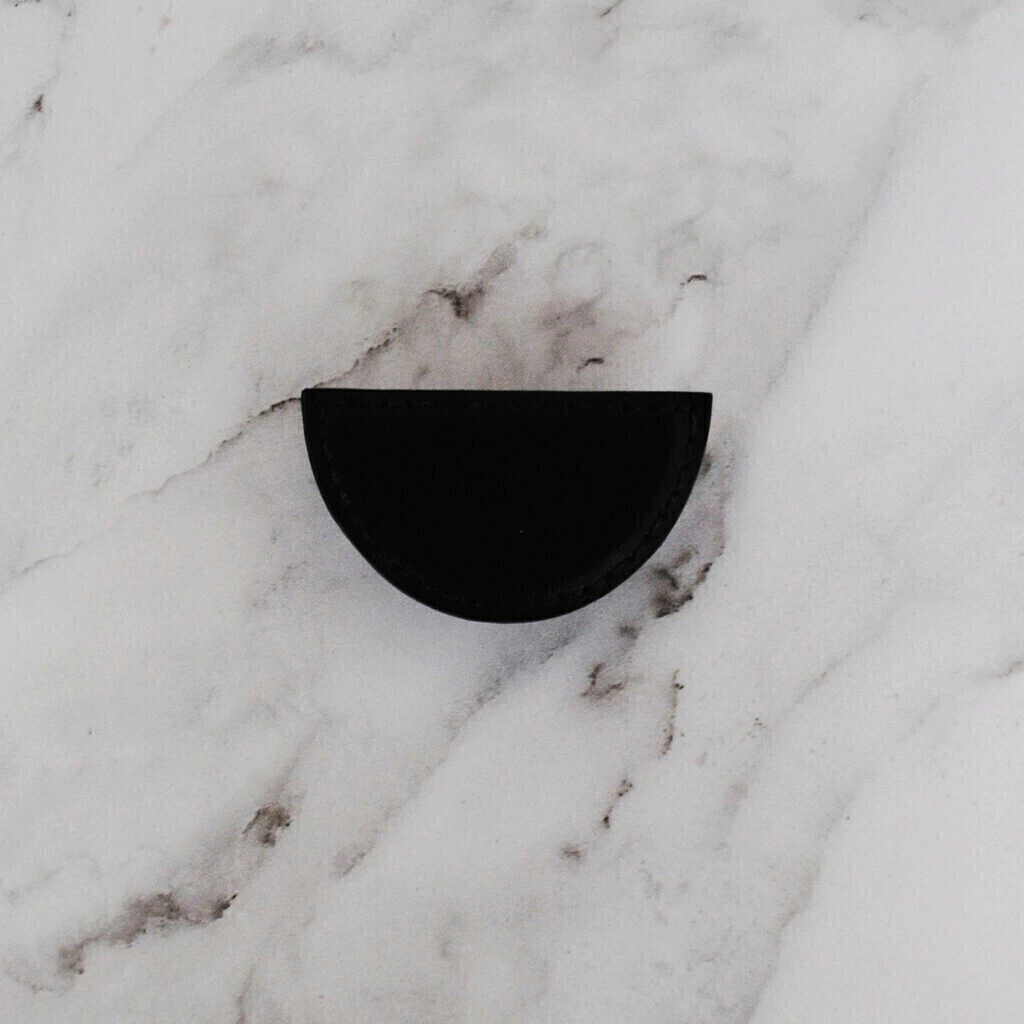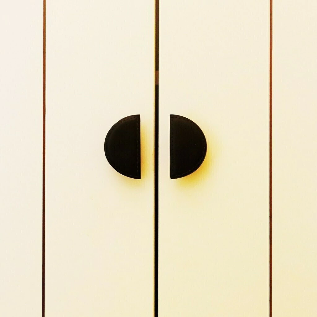 Puxador Rita P, peça em formato meia lua criada pela renomada arquiteta e designer Paola Cury, desenvolvida com metal revestido em couro reconstituído e pesponto nas bordas, garantindo um acabamento impecável.